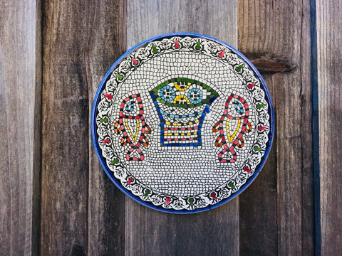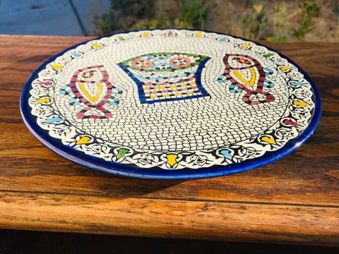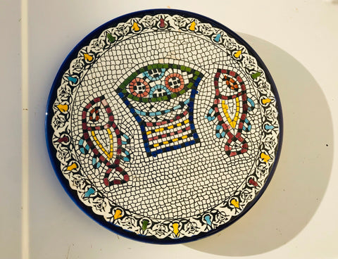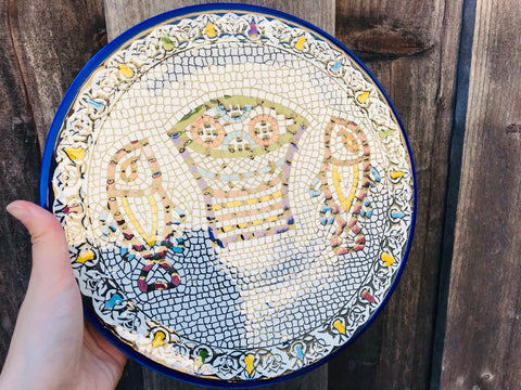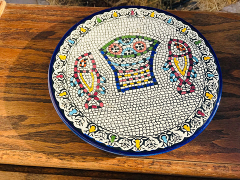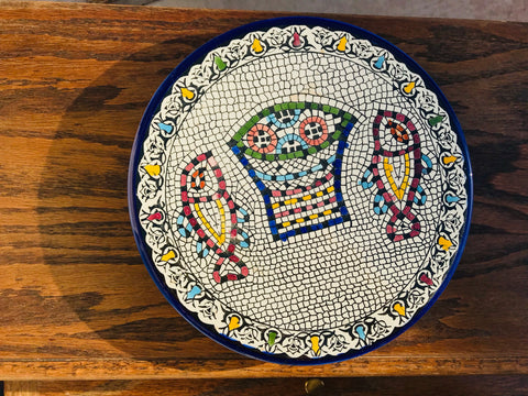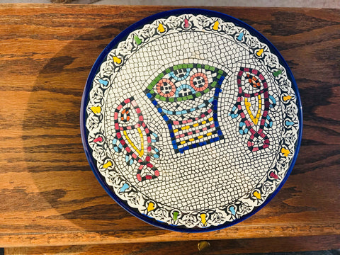 Celebrate the season with a handcrafted ceramic plate inspired by the story of abundance and sharing. This design echoes the ancient mosaic at Tabgha, symbolizing the miracle of the loaves and fishes, and is created in our small pottery and glass arts studio in Hebron, Palestine.